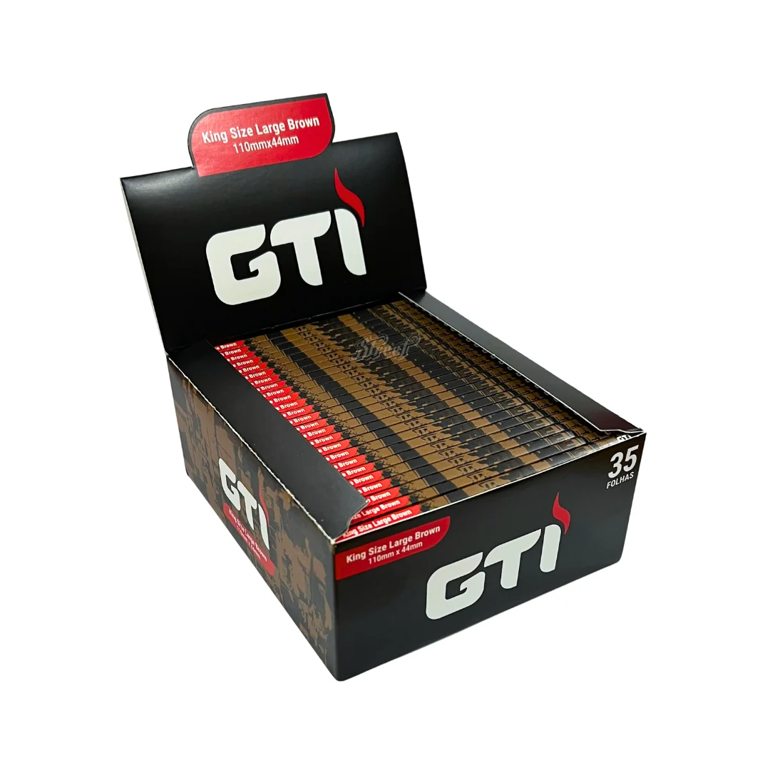 Caixa com 50 livretes de seda GTI Brown, produzida com papel natural, sem branqueadores, garantindo um sabor mais puro. Possui papel fino e resistente, fácil de enrolar, com queima lenta e uniforme.